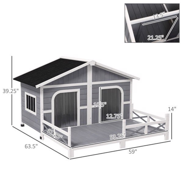 Features:- Cabin styled dog house makes an attractive addition to your yard, patio or other outdoor areas- Roomy main living house and large deck porch- Solid fir wood construction, eco-friendly and non-toxic, safe to your pets- Spacious deck, suitable for lounge and take a nap- Asphalt roof withstands most harsh weather- Raised floor protects against soggy grass, keeps your dogs from insects or moisture- Side window is included for better airflow- Front door with vinyl curtain helps eliminate drafts and keep your pet warm- Perfect for most small to medium sized dogs under 33 lbs- Slide out bottom tray for easy cleaningSpecification:- Material: Fir Wood- Color: Grey and White- Overall Dimension: 59" L x 63.5" W x 39.25" H- Main House Dimension: 53.25" L x 29.5" W x 31.5" H- Inside Door Size: 13.5" W x 21.25" H- Front Door Size: 12.75" W x 18.5" H- Bottom Board Size: 28.25" L x 25" W (left), 28.25" L x 23.5" W (right)- Max Load: 176 lbs (main house), 110 lbs (deck)- Net Weight: 99 lbsPackage Includes:1 x Dog Kennel1 x Manual