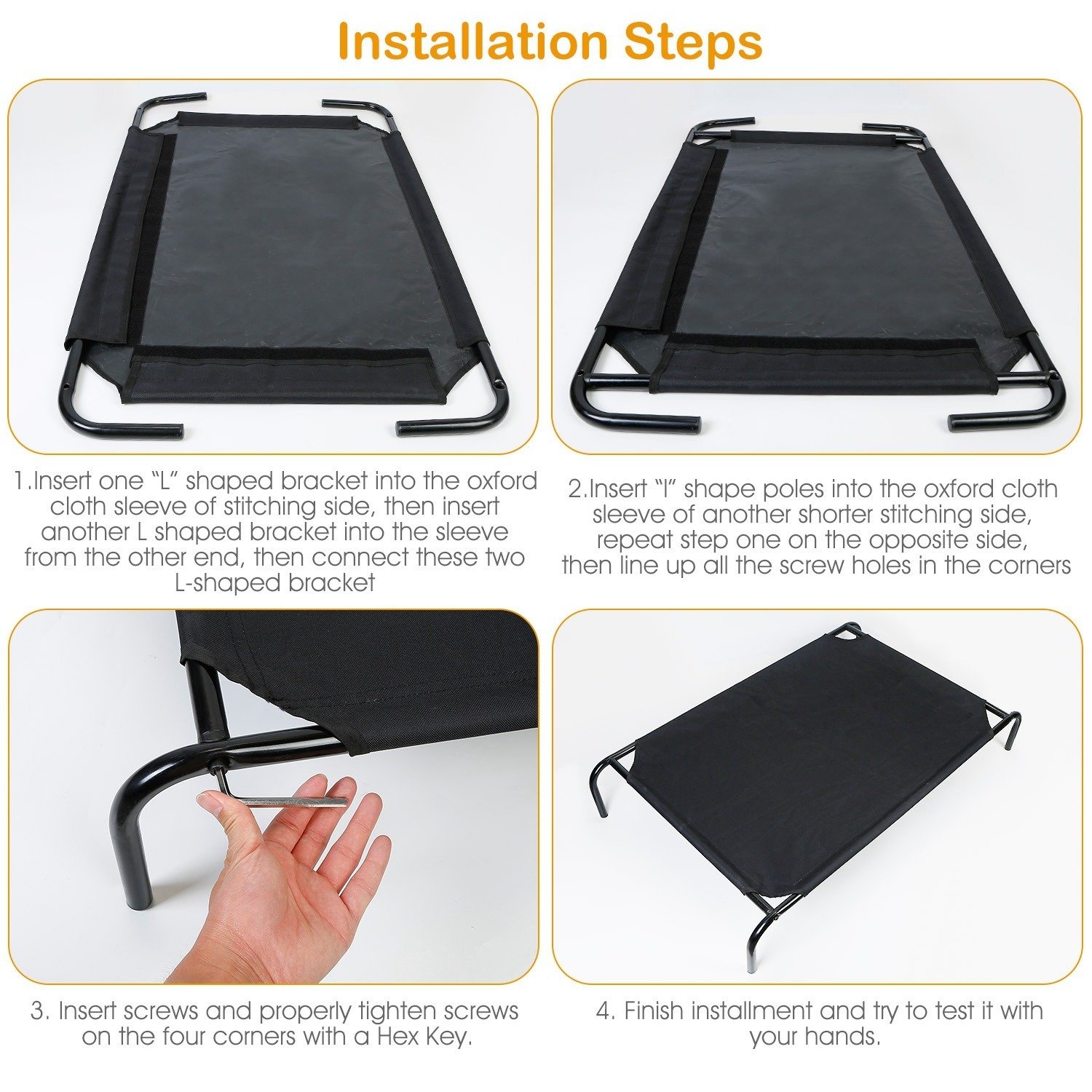 *Easy Installation*:Come with 4Pcs L shaped brackets; 2Pcs I shaped brackets and oxford fabric cloth with 2 sides stitching and 2 sides fasten tape; you can finish installation quickly. Just put the coming bed brackets through the four sides of the bed mesh fabric separately; then fix them with the screws(included). Besides; it comes with user-friendly four anti-slipping feet pads for the bed brackets.
