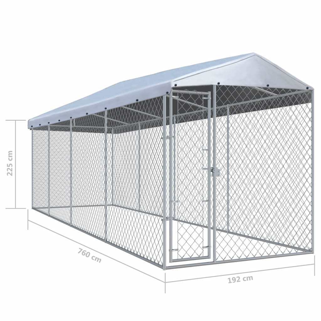 This large dog kennel provides ample exercise space while the chain link mesh all around helps prevent mischief and unexpected accidents; while enabling ventilation. Thanks to the sturdy and heavy-duty galvanized steel construction; this dog kennel is durable and built to last. The included top canopy; made of 100% polyethylene; is fire-resistant and UV protected; providing protection from sun; rain; snow and other weather conditions. The hinged door ensures extra security and safety for your dogs thanks to the lockable latch system. Assembly is really easy.Material: Galvanized steelRoof material: 100% PEOverall dimensions: 299" x 75.6" x 88.6" (L x W x H)Inner dimensions: 297.2" x 73.2" x 86.6" (L x W x H)Wall height: 176.8"Ground surface area: 157.2 ft²Lockable latch systemChain-link mesh sidewallsEasy to assembleSuitable for dogs
