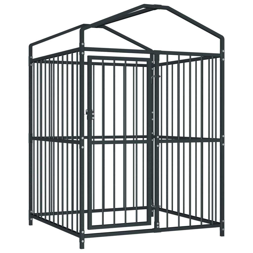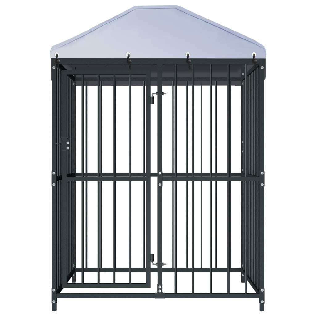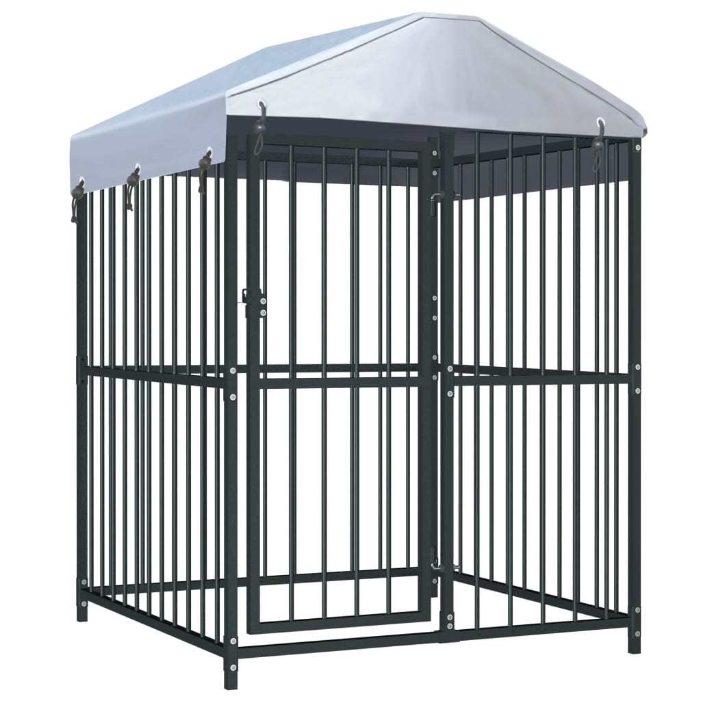 This large dog kennel provides ample exercise space while the steel bar walls help prevent mischief and unexpected accidents while enabling ventilation. Thanks to the sturdy and heavy-duty steel construction; this dog kennel is durable and built to last. The included fire-resistant and UV protected roof is made of 100% polyethylene and protects from the sun; rain; snow; and other harsh weather conditions. The hinged door has a lockable latch system which ensures extra security and safety for your dogs.