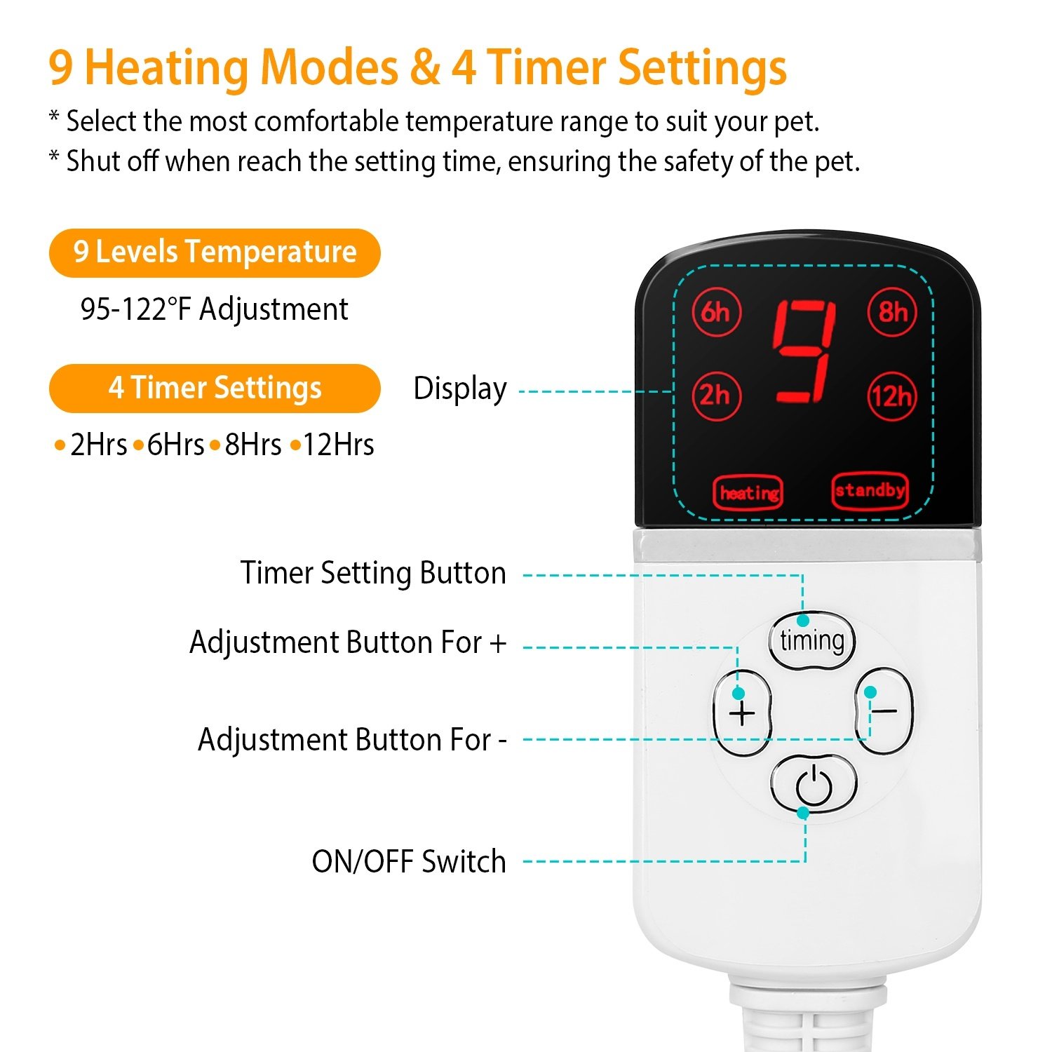 *4 Timer Settings*:Simply press the "Timer" button on the controller to set the time of 2-6-8-12 hours. And it will auto shut off when reach the setting time,ensuring the safety of the pet,conserving energy,and preventing burns caused by excessive heating.